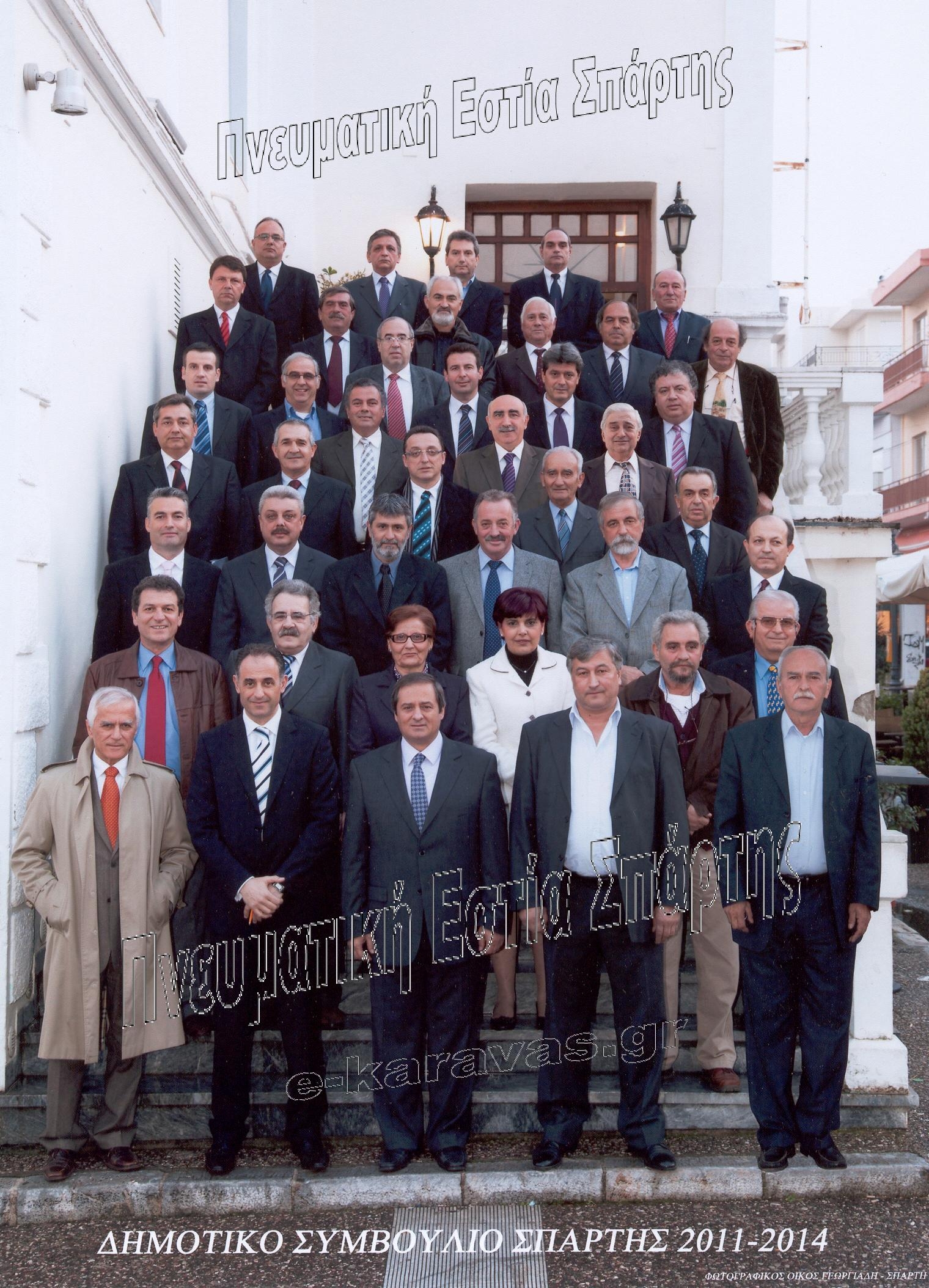 Το Δημοτικό Συμβούλιο Σπάρτης 2011-2014 σε απαρτία. Η φωτογραφία είναι του Φωτογραφικού Οίκου Γεωργιάδη στη Σπάρτη για το αρχείο της Πνευματικής Εστίας Σπάρτης.