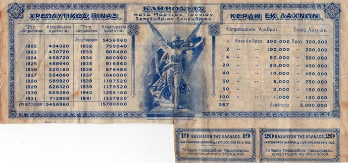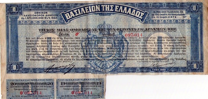 Πριν μερικά χρόνια, όταν πια δεν χρειαζόμουν την καρέκλα και οι ιστορίες και οι? παρατηρήσεις είχαν από καιρό πάψει, άνοιξα το? χρονοντούλαπο, άπλωσα τα χέρια στο καλάθι και άρχισα τη δική μου αναδρομή! Εκεί, ανάμεσα στα παλιά κέρματα, ανακάλυψα κάτι που μοιάζαν με χαρτονομίσματα. Με μια δεύτερη, καλύτερη, ματιά διαπίστωνε κανείς πως επρόκειτο για ελληνικά Ομόλογα: «ΒΑΣΙΛΕΙΟΝ ΤΗΣ ΕΛΛΑΔΟΣ», «ΤΙΤΛΟΣ ΜΙΑΣ ΟΜΟΛΟΓΙΑΣ ΕΙΣ ΤΟΝ ΦΕΡΟΝΤΑ ΕΚ ΔΡΑΧΜΩΝ 100», «Δι? το? Νόμου 2749 τ?ς 25ης Μαρτίου 1922?»