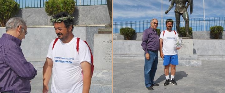 Στο σημείο τερματισμού της 12ήμερης πορείας του, στο άγαλμα του Λεωνίδα, τον κ. Τετριμμίδα υποδέχθηκε ο πρόεδρος του ΝΠΔΔ Πολιτισμού, Αθλητισμού και Περιβάλλοντος του Δ. Σπάρτης κ. Μάριος Τζωρτζάκης, προσφέροντας του ένα στεφάνι ελιάς και ένα αναμνηστικό αγαλματίδιο.