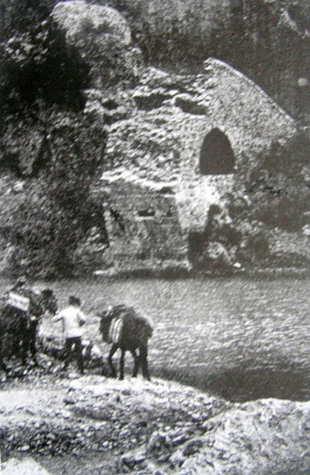Γκραβούρα που απεικονίζει το «Γεφύρι του Κόπανου» μετά την καταστροφή του το 1902